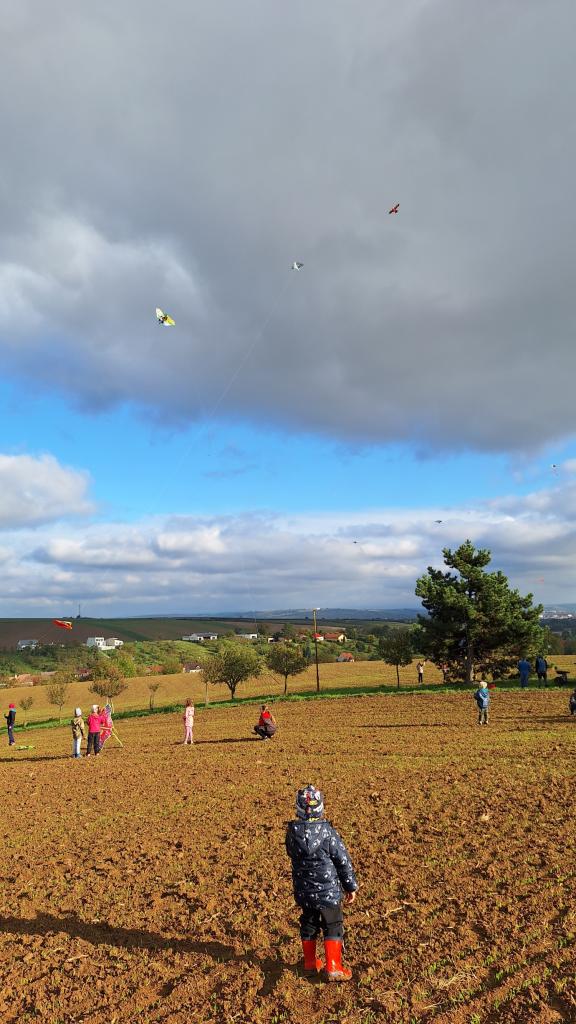 Jelikož nám přálo i počasí i dobrý boční vítr, sešlo se nás opravdu hodně, od těch úplně nejmenších až po jejich rodiče. Draků se ve vzduchu vystřídala celá barevná škála – zastoupena byla např. Tlapková patrola, Ledové království, tučňák, Krteček, ale také drak s nejdelším ocasem. Rodiče vydatně pomáhali dětem nejen s vypuštěním draků na oblohu, ale také se snesením zamotaného draka ze stromu. V jednom momentě se ve vzduchu objevilo i opravdové rogalo, jehož majitel si přišel draky prohlédnout z bezprostřední blízkosti.