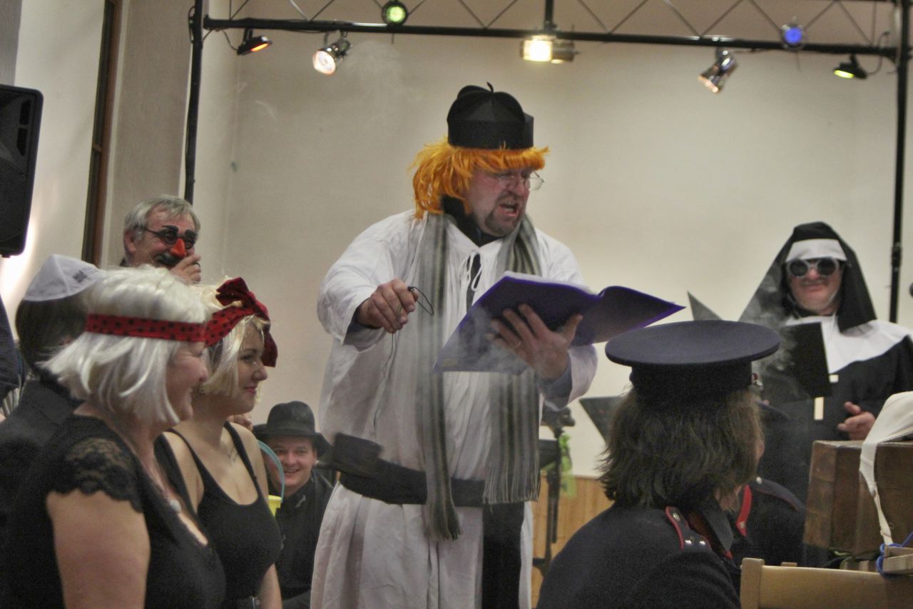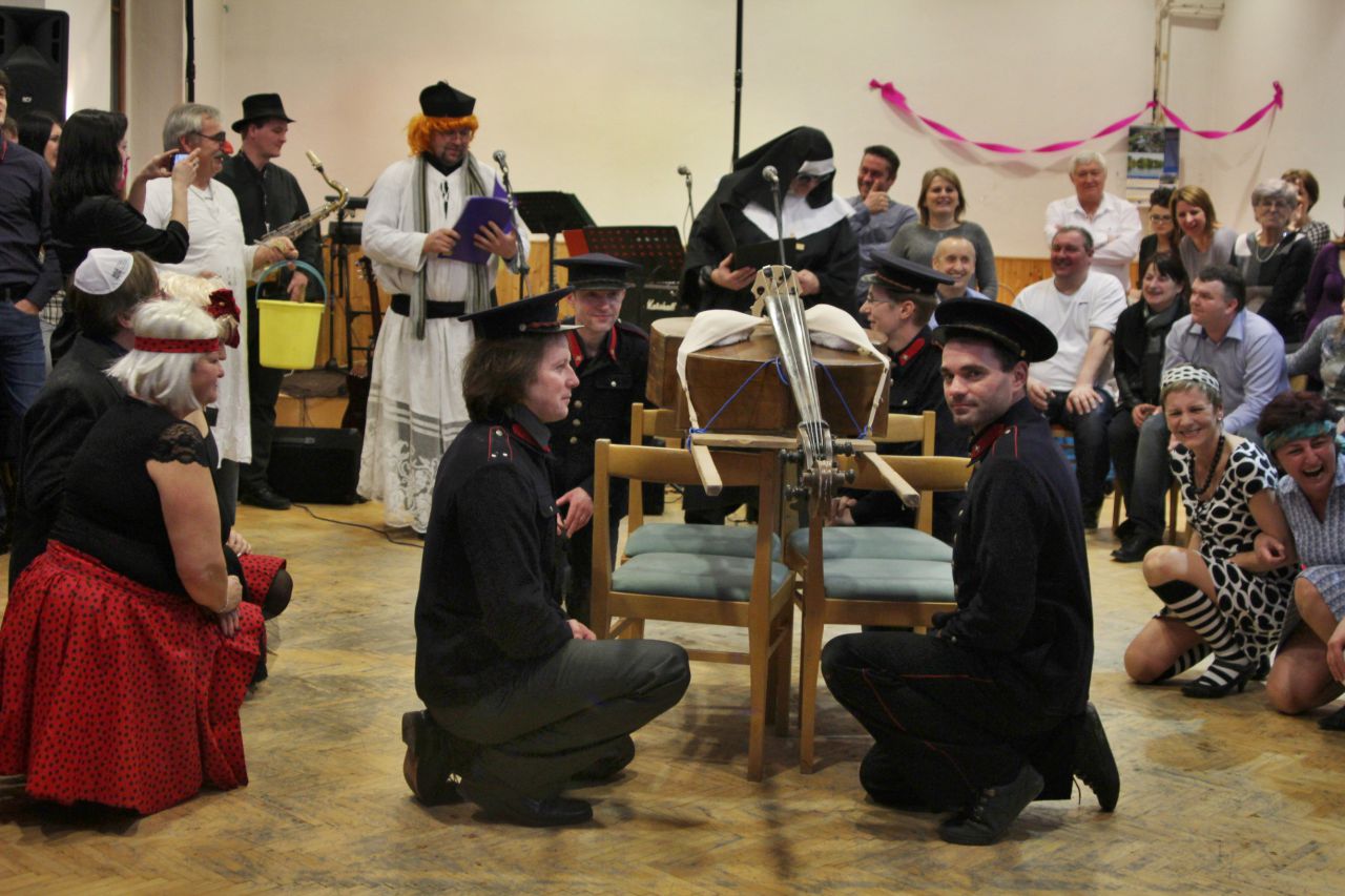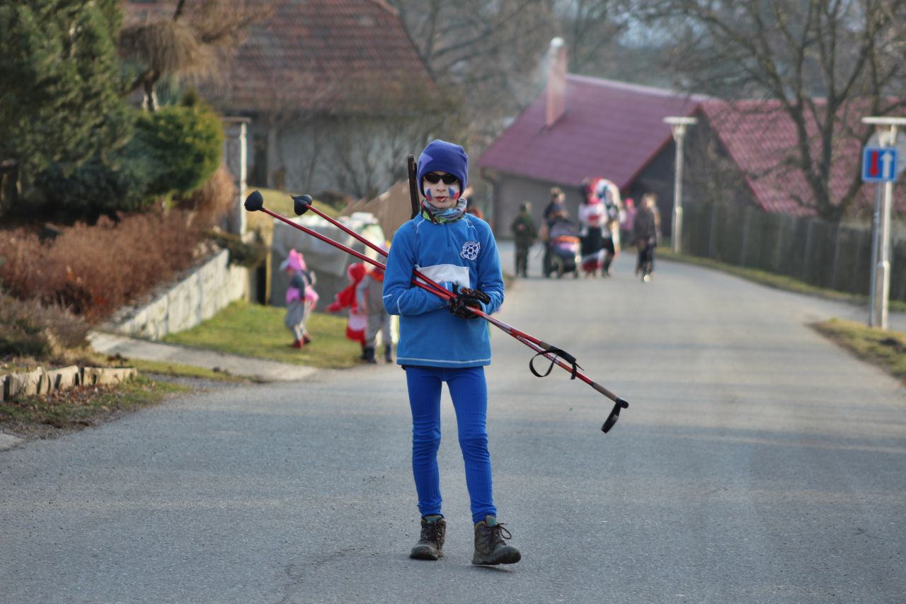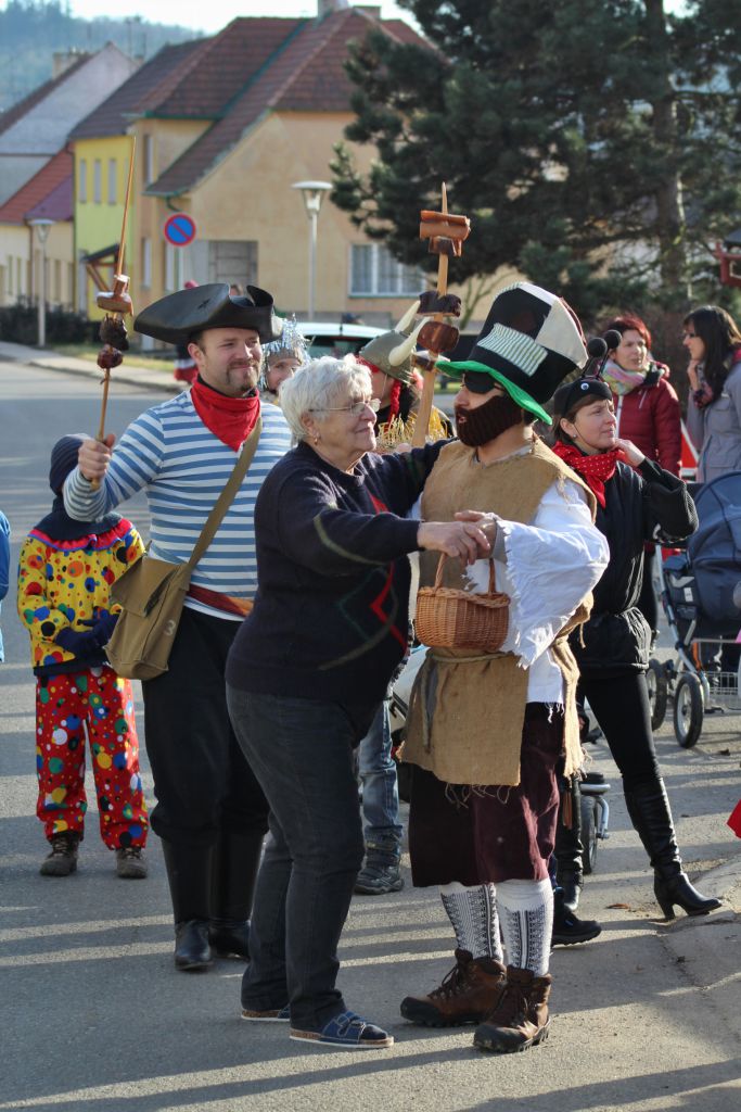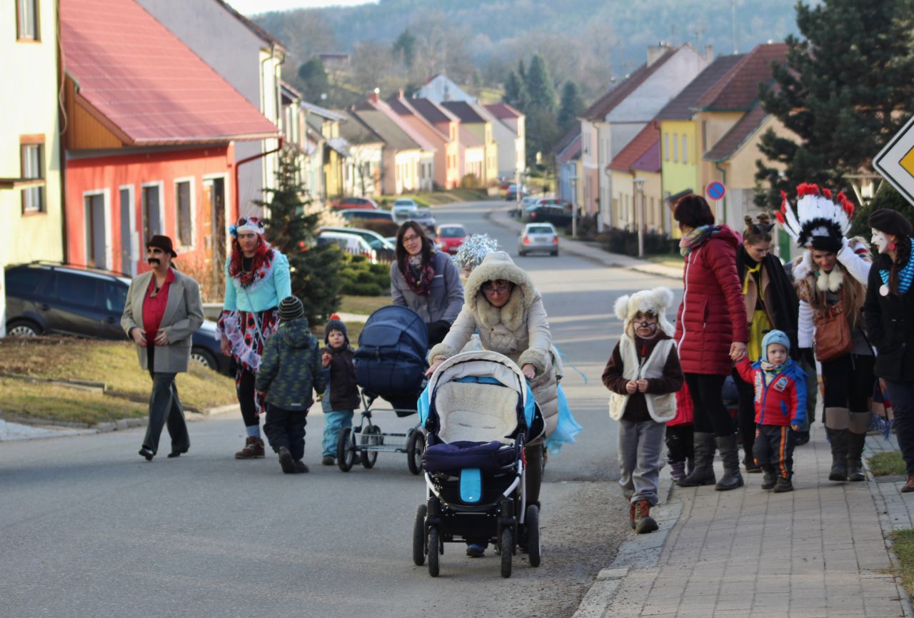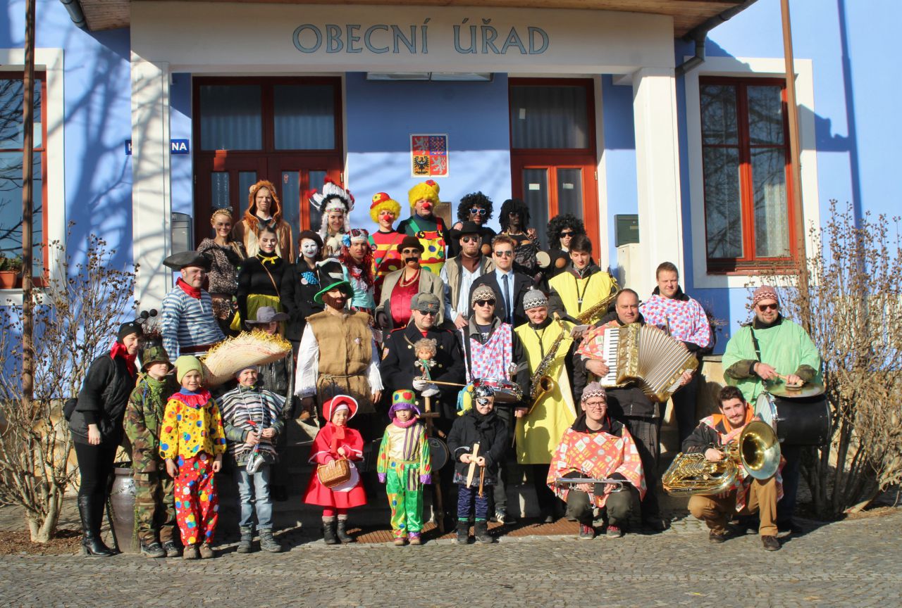 Tradiční pochůzka chasy v maskách po obci a končinová zábava s pochováváním basy